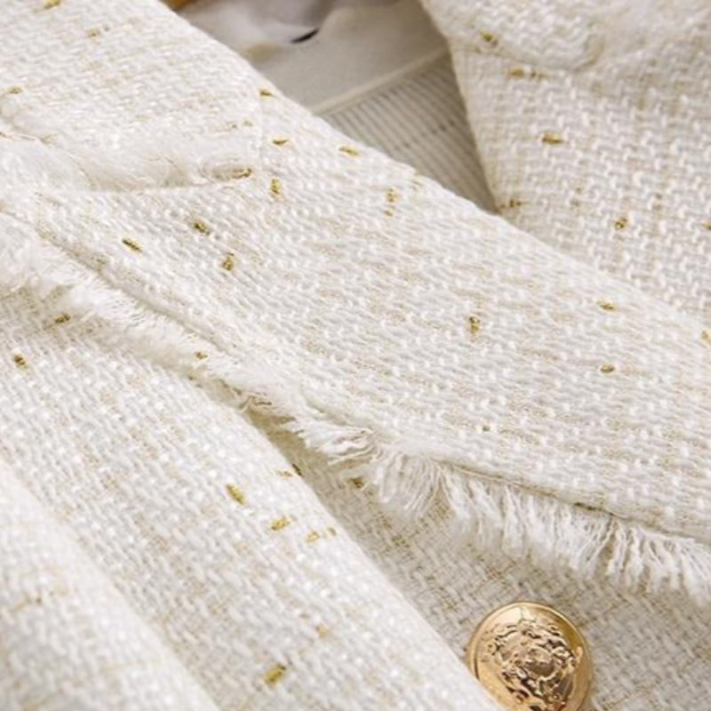 The MÉZICA™ Blazer is where timeless structure meets refined elegance. Crafted from structured tweed and adorned with striking gold-toned buttons, this double-breasted blazer is a bold statement wrapped in sophistication. The notched collar adds a classic touch, while the subtle fringed hem softens the strong silhouette with effortless grace.